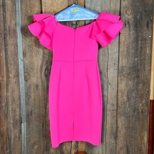 Chic off shoulder design with ruffle detail. Bold pink hue. Perfect for standout style.