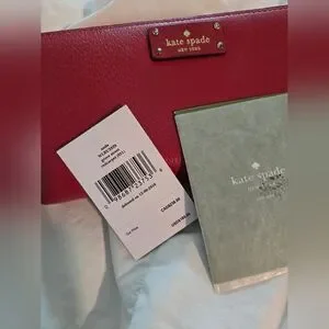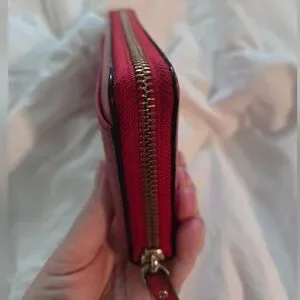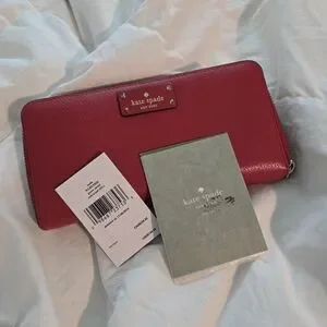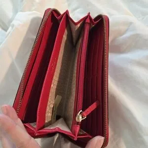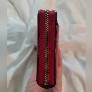 Add a pop of color to your everyday essentials with this Kate Spade New York red leather zip-around wallet. Crafted from textured leather with gold-tone hardware, it features a secure full zip closure and the iconic Kate Spade logo plaque on the front. Compact yet spacious, this wallet offers multiple card slots, a center zip pocket for coins, and compartments for cash or receipts.