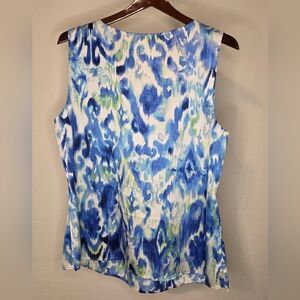 Chico’s sleeveless tank top in a vibrant blue, green, and white abstract print. Features a scoop neckline with pleated detailing at the front for a flattering drape. Lightweight with a hint of stretch for comfort. Perfect for layering under a cardigan, blazer, or wearing on its own in warm weather.