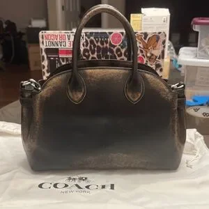 Chic Coach satchel with a metallic black finish. Sleek design with elegant handles. Ideal for elevating any outfit.