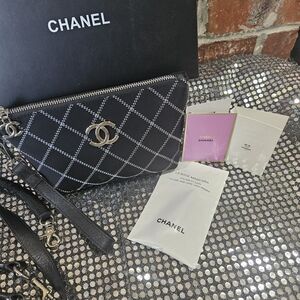 Elevate your style with this elegant Chanel black clutch bag. Perfect for any occasion, this bag combines luxury and functionality.(straps optional are not Chanel) comes with luxury samples.