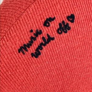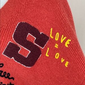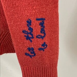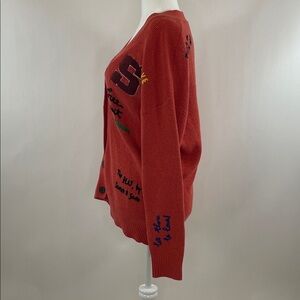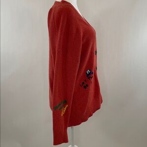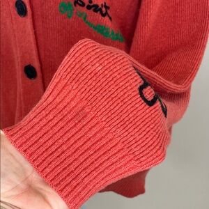Orange knit (41% Nylon, 27% Acrylic, 24% Wool, 8% Alpaca). Cardigan. Long sleeves. V-neck. Front button closure.