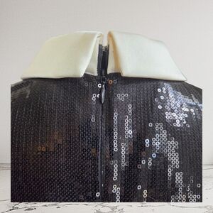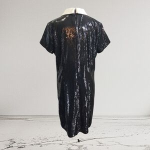 Shimmering black sequin dress. Asymmetrical design. Short sleeves with a white collar. Perfect for evening wear. Length 36 Ptp 18" " Sleeves 6