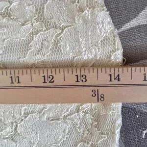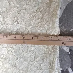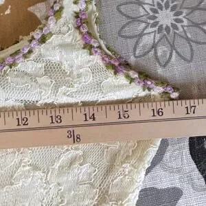 90's USA Betsey Johnson Luxe Lace Mini Dress in a Delicate Creamy Ivory Colored Lace with Delicate Purple Floral trim. Has gores in the front and back for a Skater Flowy Hem. Lined. Dress has Stretch and is shown in measurements.