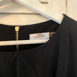 Chic black midi dress by Calvin Klein. Features stylish buckle accents. Ideal for any event.