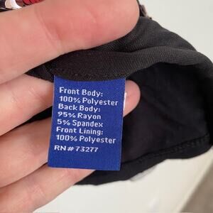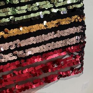 Very Good Condition. Polyester, Rayon, Spandex. Sequins attached to mesh over black polyester tank.