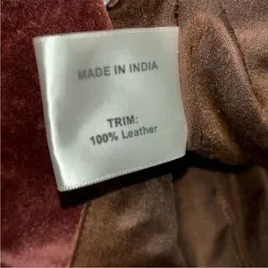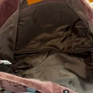 Aubergine (brownish plum) cotton velvet with embroidered front, black leather shoulder straps and trim. Brown lining with zipper pocket and open pocket (approx. 4.5” w x 4” tall). Magnetic snap closure.