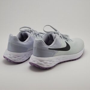 Gently used Nike Revolution 6 Next Nature running shoes in light grey with lavender soles and black swoosh. Lightweight, breathable mesh upper and soft foam cushioning for all-day comfort. Stylish, versatile, and perfect for everyday wear or workouts!
