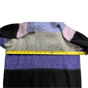 Long sleeve wool and mohair-blend sweater featuring multicolor stripes. Rib knit crewneck collar, sleeves, and hem. Tonal stitching.