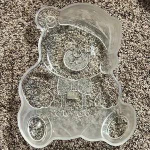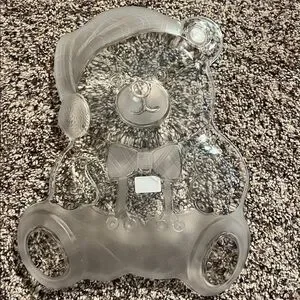 Vintage Mikasa "Holiday Bear" Crystal Serving Platter. It is shaped like a teddy bear wearing a Santa hat and a bow tie. The platter is made of clear and frosted crystal glass.