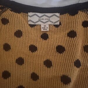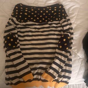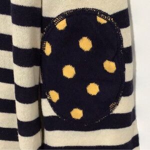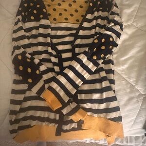 Stylish cardigan with black and yellow stripes. Features polka dot accents. Perfect for a trendy look. So sweet.