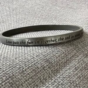 Add a touch of nostalgic charm to your jewelry collection with this vintage pewter Good Works bracelet featuring the saying, Love puts the fun in together, the sad in apart, the hope in tomorrow and the joy in the heart, from the poem "Love" by Rod McKuen. This unique piece is perfect for collectors, or anyone who loves meaningful vintage accessories. Sturdy pewter construction with timeless character — a great conversation starter and gift idea!