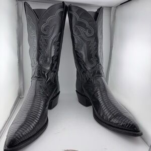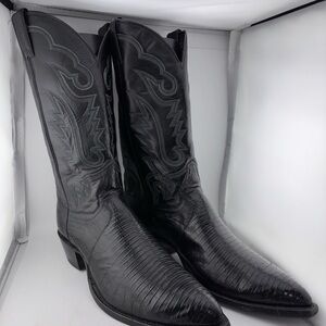Vintage Justin Men's boot black lizard and 12.5 Inch shaft .This boot also features a pointed Toe with stacked Heel and Leather Outsole for long wear. Whether out on the town or working on the ranch, you won't go wrong with the purchase of this fine Justin product. Justin Boot Company, makers of fine quality western boots and shoes since 1879.