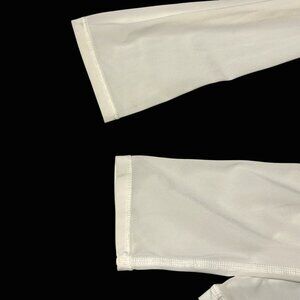 This Lululemon long sleeve tee is designed with mesh fabric for optimal breathability and comfort. It's ideal for yoga or travel, allowing ease of movement. The white color and sleek design make it versatile for various occasions. Durable and lightweight, it provides a stylish yet functional wardrobe addition.