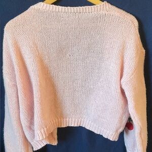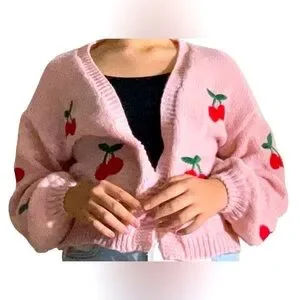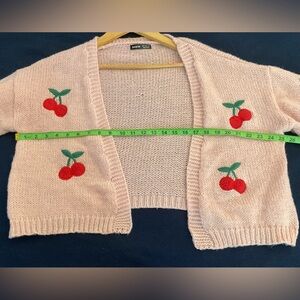 Charming pink cardigan with cherry embroidery. Soft knit fabric. Perfect for casual wear. Measurements are 19 inches top from bottom and across is 25 inches only worn a few times in great condition