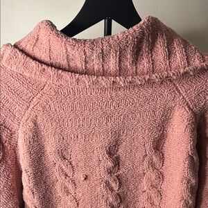 Elegant pink sweater with a cozy cowl neck. Features intricate cable knit design. Ideal for layering.