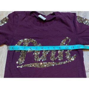 Women's maroon t-shirt featuring gold sequin logo detail and short sleeves. Comfortable, lightweight, and stylish for casual wear.