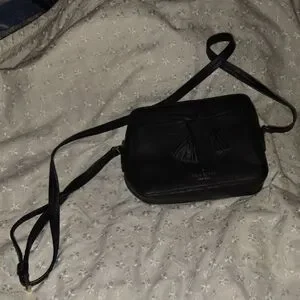 Elegant black crossbody bag. Features tassel accents. Adjustable strap for comfort.