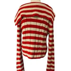 This playful Zara cardigan is designed in a bold red-and-white stripe pattern, bringing a cheerful yet chic touch to your wardrobe. Crafted in a soft knit, it features a button-front closure with gold-tone buttons, long sleeves, and a wide collar for a modern twist. The cropped fit adds versatility, making it perfect for layering over dresses, tanks, or high-waisted jeans.
