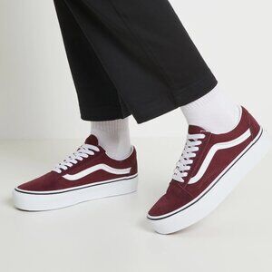 The product is a pair of VANS Old Skool sneakers in Port Royale Burgundy, designed for men in a size 10.5. These athletic shoes feature a red suede upper material, making them both stylish and durable. The VANS Old Skool model is known for its classic sneaker style and is part of the VANS Old Skool product line, combining comfort and fashion effortlessly. Perfect for everyday wear or for adding a touch of flair to your athletic outfit.