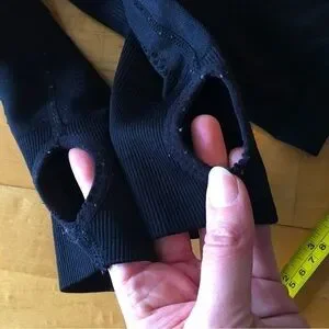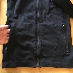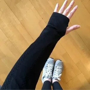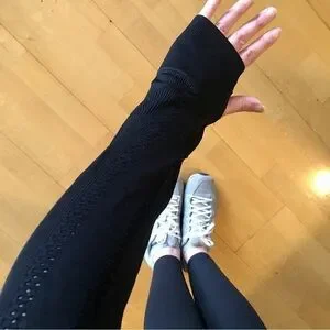 Check out the pretty cutout abstract design in the material that shows when stretched a bit (ie when it’s on, lol…tried to show in the pics). Thumbholes! Zippered pockets (essential if you’re a runner or want peace of mind for your keys, phone, etc while on a walk or at the studio). Very soft and comfy to wear…it’s stretchy so will conform to your body. The best! 😍