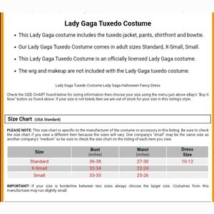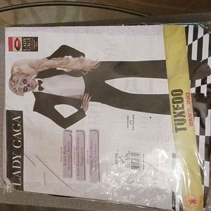 This Lady Gaga costume includes the tuxedo jacket, pants, shirtfront and bowtie.