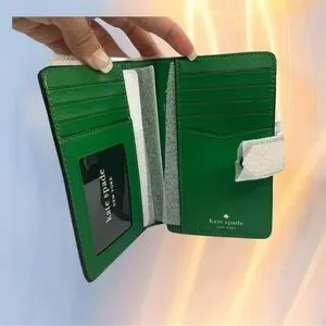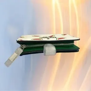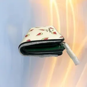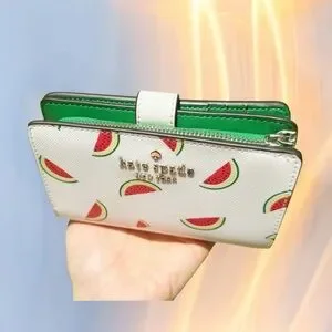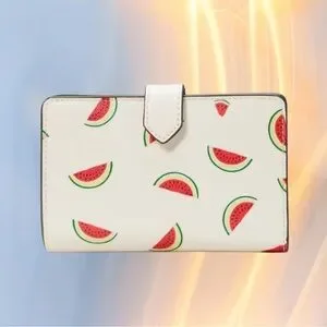 This vibrant and playful Kate Spade Staci bifold wallet features a fresh watermelon print, perfect for adding a touch of summer to your accessories. Crafted from durable crossgrain leather with a bright green interior and gold-tone hardware.