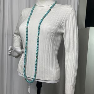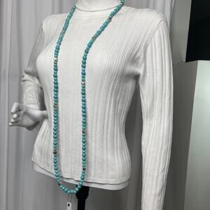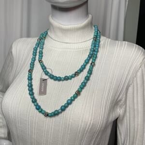 Chico’s Chicos necklace costume signed jewelry long turquoise colored beads (cold to the touch - appear to be dyed stone, maybe howlite) with silver tone beads interspersed... unworn with tags attached. Original MSRP $55.00. 50" long, these continuous beads can we worn as is, or wrapped, or even combined with a scarf of some kind. They are timeless.