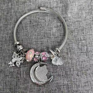 Charming Hello Kitty bracelet with silver and pink accents. Features adorable charms including Hello Kitty, a butterfly, and more. Perfect for fans and collectors.