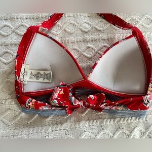 NWT brand new! Stylish red bikini top with floral design. Ideal for beach and pool days. Polyester & spandex. Neck and back tie straps. Padding. Women’s size medium. Smoke free home