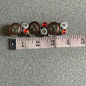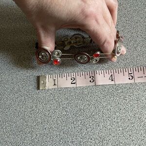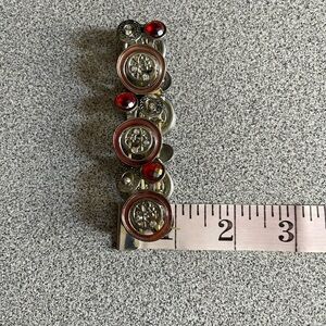 This elegant bracelet features a stunning combination of red, silver, and gold tones. Perfect for adding a touch of sophistication to any outfit.