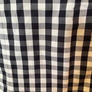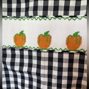 This jon jon features a navy & white gingham check print, front fabric covered buttons, and pumpkin smockings.