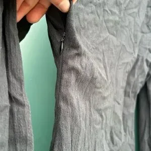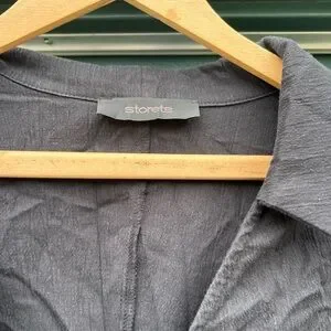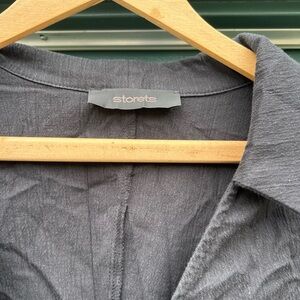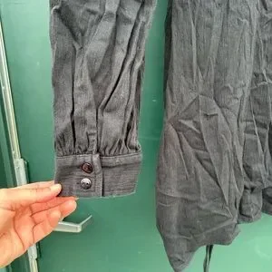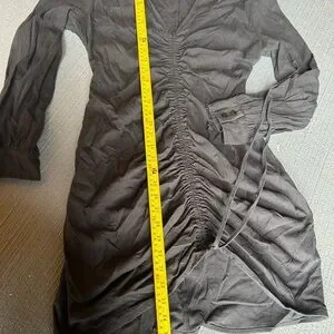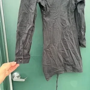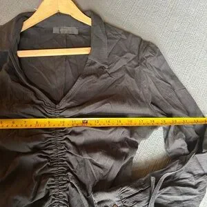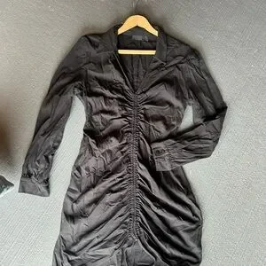 Elegant black midi dress with ruched detailing. Long sleeves and buttoned cuffs. Perfect for any occasion.