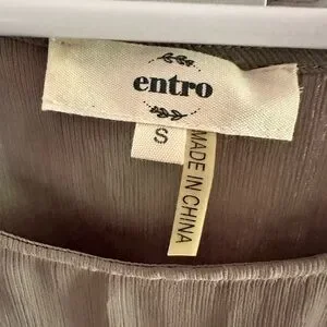Elegant sage green blouse by Entro. Features unique ruched sleeves. Lightweight and stylish.