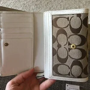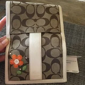 Stylish Coach wallet in brown and white. Features floral embroidery. Perfect for any occasion.