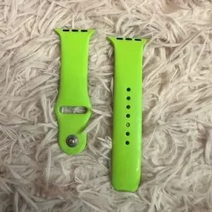 lime green rubber band for Apple Watch. not sure its size, but shown in pic is how it fits on my 41mm. even though a little sticks out on the edges it is very secure.