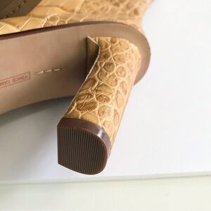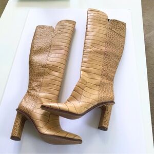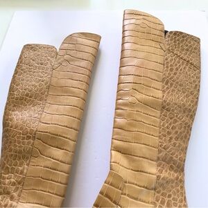 Leg lengthening silhouette croc embossed leather boots, inner ankle zipper, 3.75” block heel, shaft 15.75”, almond toe, color is called cashew, NEW