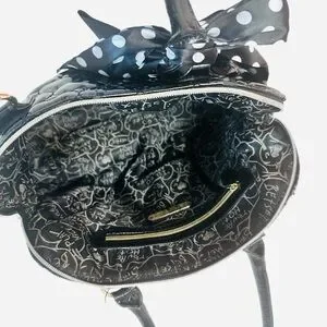 The spacious interior is lined in black and beige and includes one convenient zipper pocket for organization.