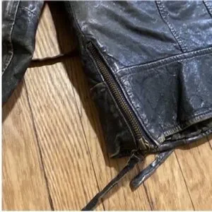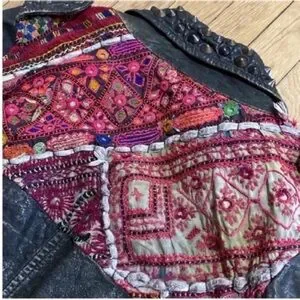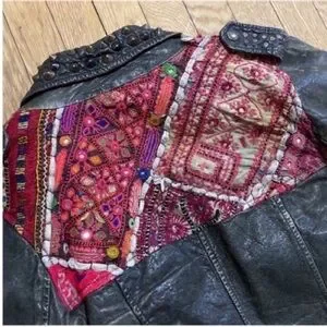 All saints leather jacket with studs and back embroidered design. One of a kind jacket purchased in NYC flagship store around 2005. Each jacket had a different design on the back. This one has mirrors. Side zippers and sleeve zippers. Front pockets. Preloved. Was sold distressed. I’ve lost weight now too big for me. Moving sale offers welcomed thanks!