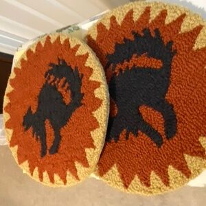 Halloween items are: Two (2) wool hooked 14" round scary cat chair pads. Two (2) 100% cotton dish towels with different pictures. One set of (2) 100% cotton dish towels with black cats and pumpkins. Two wood carved items, a black cat that can hang on something measures around 4" x 4" x 3/4", and an orange pumpkin that measures 5 1/2" x 5 1/4" x 3/4". A ceramic round pumpkin with face cut out that measures around 3" tall by 3 1/2" diameter.
