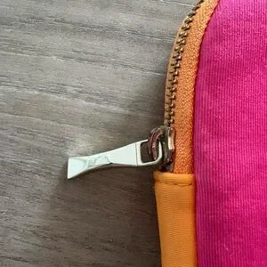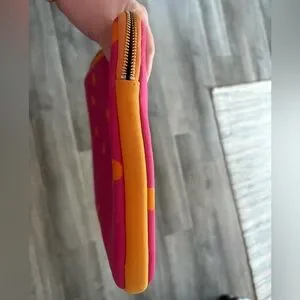 Bright and fun Kate Spade New York neoprene laptop sleeve in hot pink with orange polka dots and trim. Features:
