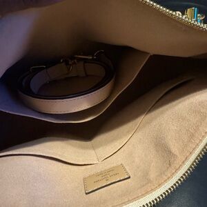 monogram in beige. The bag teatures leather handles, an optional shoulder strap, a hidder front zipper pocket, and gold hardware. T top zipper opens to an expansive beige pli. microfiber interior with patch pockets.