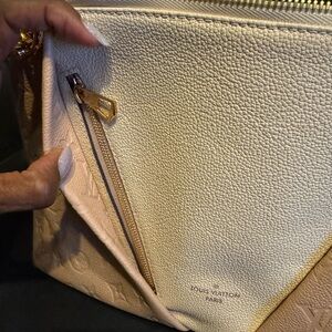 Empreinte V Tote MM in Beige, Rose, and Creme. This shoulder bag is crafted of soft calfskin leather with embossed Louis Vuitton