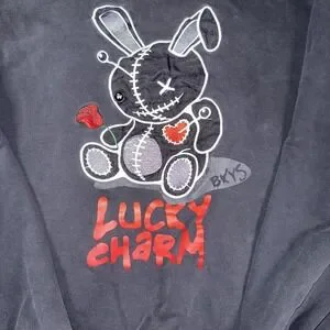 Features a stitched and embroidered graphic of a patchwork bunny holding a red flower and heart patch with "Lucky Charm" text on the front. BKYS branding appears on both the front and the small logo patch on the back hem.