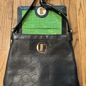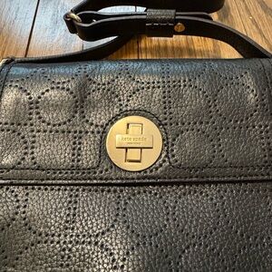 Elegant black shoulder hobo bag with embossed design. Features signature Kate Spade logo and sleek gold metal closure. Comes with PINK Kate Spade bag.