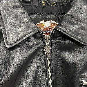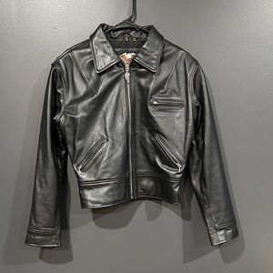 Stylish black leather jacket with zippered pockets and embossed leather logo on back