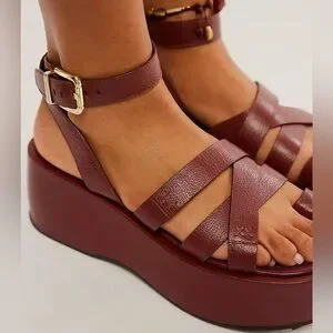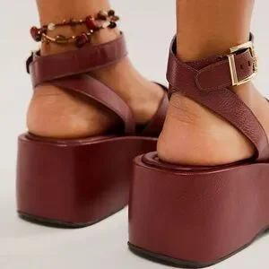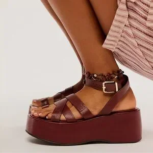 Features: Slip-on style, leather uppers, strappy design, toe loop, adjustable buckle ankle strap, flatform sole, lined footbed