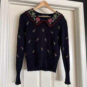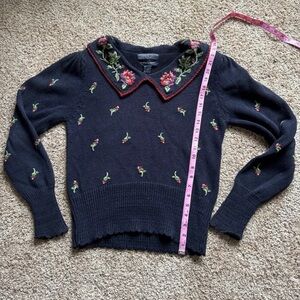 Features: Hand-embroidered floral design on the collar and throughout the sweater, a ribbed hem, and a pointed collar.