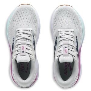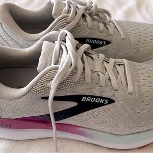 Stylish Brooks sneakers with a white base and pink and mint accents. Perfect for running and casual wear.