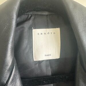 Chic black leather jacket by Sandro. Features classic biker style with silver zippers. Ideal for a modern look.